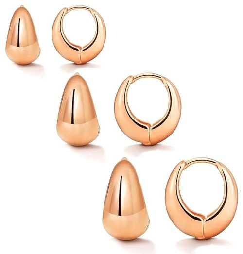 VAMA 3Pairs 18K Gold Filled Anti Tarnish Hoop Earrings Set for Women Chunky Rose Gold Silver Hypoallergenic Small Lightweight Tiny Thick Trendy Huggie Hoop Earring Stacks For Multiple Piercing