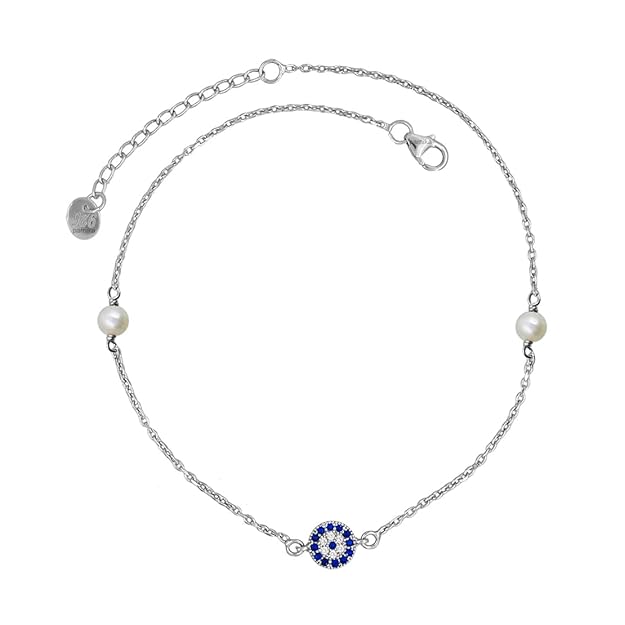Elegant sterling silver evil eye anklet with pearls & crystals. Stylish, protective & durable—perfect for daily wear, gifts & positive energy.